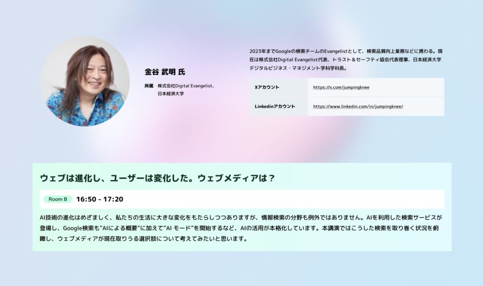 AI技術の進化はめざましく、私たちの生活に大きな変化をもたらしつつありますが、情報検索の分野も例外ではありません。AIを利用した検索サービスが登場し、Google検索も”AIによる概要”に加えて”AI モード”を開始するなど、AIの活用が本格化しています。本講演ではこうした検索を取り巻く状況を俯瞰し、ウェブメディアが現在取りうる選択肢について考えてみたいと思います。